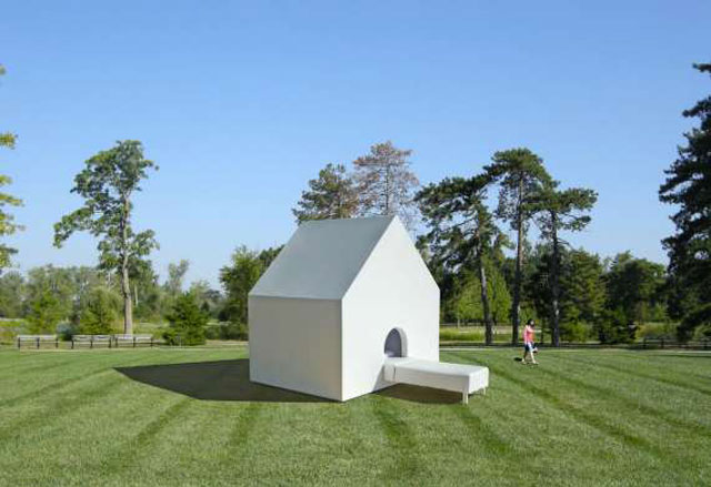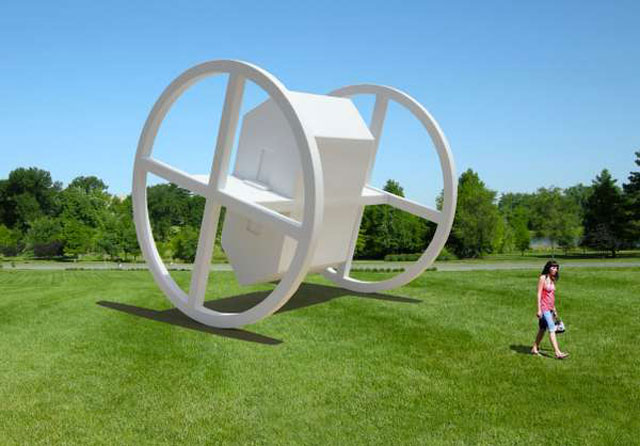 All of Jantzen’s house sculptures are monochromatic and are made using a single material to build the house and the added on shapes. His houses have been transformed to range from a house on stilts, to a house on wheels, to a house on a rocker and a house with an orbiting door.