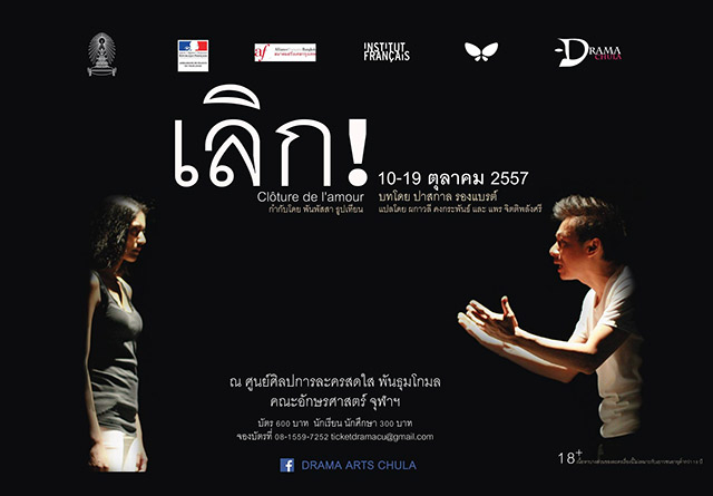 ภาควิชาศิลปการละคร คณะอักษรศาสตร์ ร่วมกับสถานเอกอัครราชทูตฝรั่งเศสประจำประเทศไทย ขอเชิญทุกท่านมาร่วมสัมผัสกับอีกด้านของความรัก จากบทละครฝรั่งเศสที่ดังระดับโลก