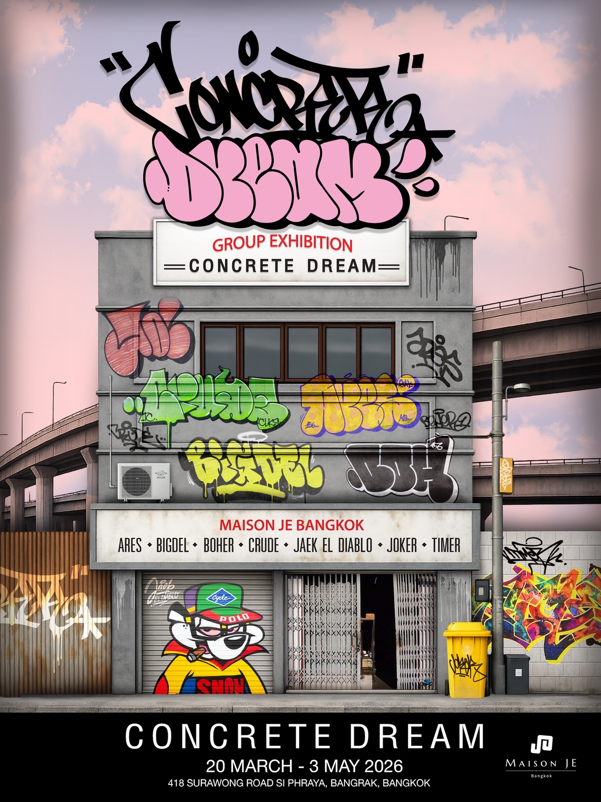 นิทรรศการ Concrete Dream จัดแสดงระหว่างวันที่ 20 มีนาคม – 3 พฤษภาคม 2569 ณ Maison JE Bangkok ถนนสุรวงศ์ แขวงสี่พระยา เขตบางรัก กรุงเทพฯ เปิดให้เข้าชมทุกวันอังคาร – อาทิตย์ เวลา 11.00 – 19.00 น. (ปิดวันจันทร์) ติดตามความเคลื่อนไหวได้ที่ Facebook: Maison JE Bangkok หรือโทร. 096 221 1646